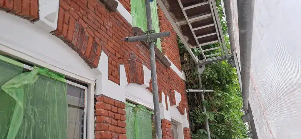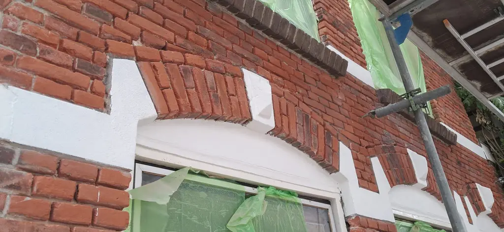 Naast het werk aan het metselwerk hebben we ook het aanwezige betonwerk zorgvuldig hersteld en opnieuw ingekleurd. Hiermee wordt niet alleen de constructieve veiligheid geborgd, maar ook de esthetiek van het pand verbeterd. Door juiste technieken en duurzame materialen te gebruiken, zorgen we ervoor dat het beton weer jarenlang bestand is tegen weersinvloeden.